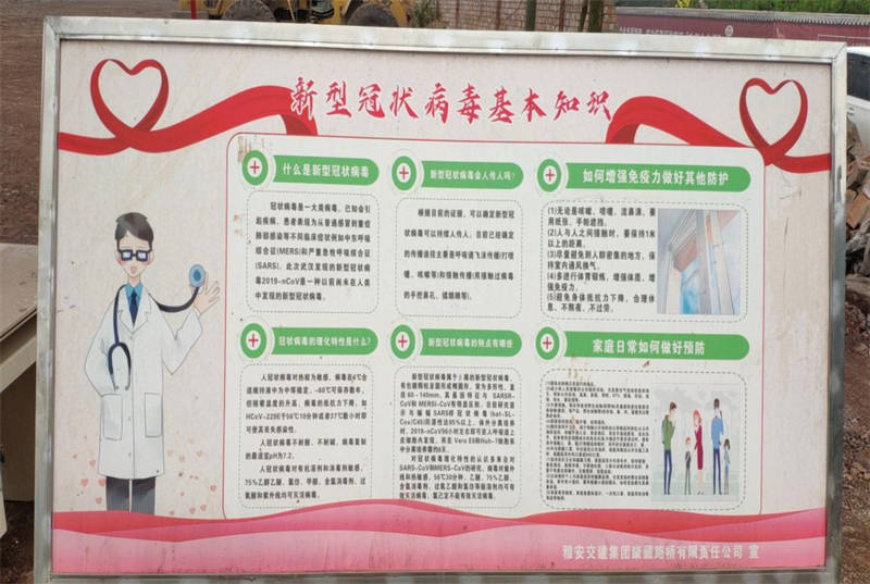 一是創(chuàng)新宣傳形式,利用公司QQ群、微信群、推送《中華人民共和國傳染病防治法》、《四川省應對新冠肺炎疫情分區(qū)分級差異化防控指南(第二版)》、《雅安市新型冠狀病毒肺炎疫情防控工作要點指引》等法律法規(guī),每日持續(xù)有效的傳播疫情防控的信息,加大健康教育宣傳,引導職工不信謠不傳謠,營造良好的輿論環(huán)境。二是落實責任主體,在公司、各項目部張貼疫情防控法制宣傳展板、懸掛宣傳橫幅、發(fā)放防控宣傳冊,設立疫情防控教育專欄,向項目參建人員宣講疫情防控知識,做好疫情群防群治工作,營造濃厚的防控宣傳氛圍。三是精準發(fā)力,組織已進場勞務人員開展疫情防控及復工復產(chǎn)安全教育培訓,確保項目復工復產(chǎn)和疫情防控工作有序推進。