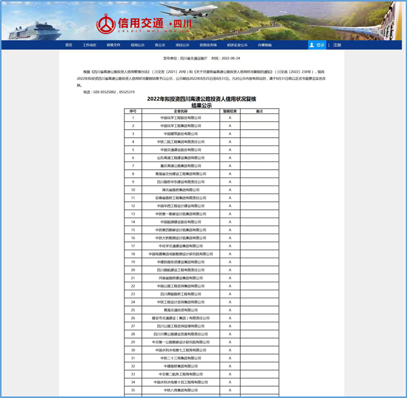 近日,四川省交通運輸廳“信用交通(四川)”公示2022年擬投資四川省高速公路投資人信用狀況復(fù)核結(jié)果和2022年第3批擬投資四川省高速公路投資人初次信用評價結(jié)果,雅安市交通建設(shè)(集團)有限責(zé)任公司及下屬全資子公司四川康藏路橋有限責(zé)任公司獲得“A”級信用評價。