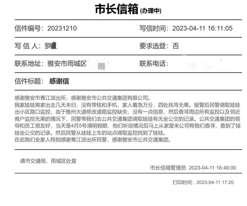 日前,市民羅女士的孩子離家出走,四處尋找無果。4月5日,時值清明假期,羅女士來到公交集團(tuán),希望工作人員幫忙查詢孩子乘坐公交車的記錄。得知情況后,公交集團(tuán)值班人員立即通知相關(guān)技術(shù)人員到崗到位,根據(jù)羅女士提供的戶口簿信息,通過后臺查詢到孩子使用學(xué)生卡在市區(qū)乘坐公交車的記錄及相關(guān)車輛的監(jiān)控視頻,并會同公安干警完整梳理出孩子的活動軌跡,不到半個小時,成功協(xié)助家長找到離家出走的孩子。事后羅女士帶著感恩之情和禮物,專程到公交集團(tuán)表示感謝,公交集團(tuán)工作人員婉言謝絕了羅女士的禮物。隨后,羅女士在市長信箱寫下了這封誠摯的感謝信。