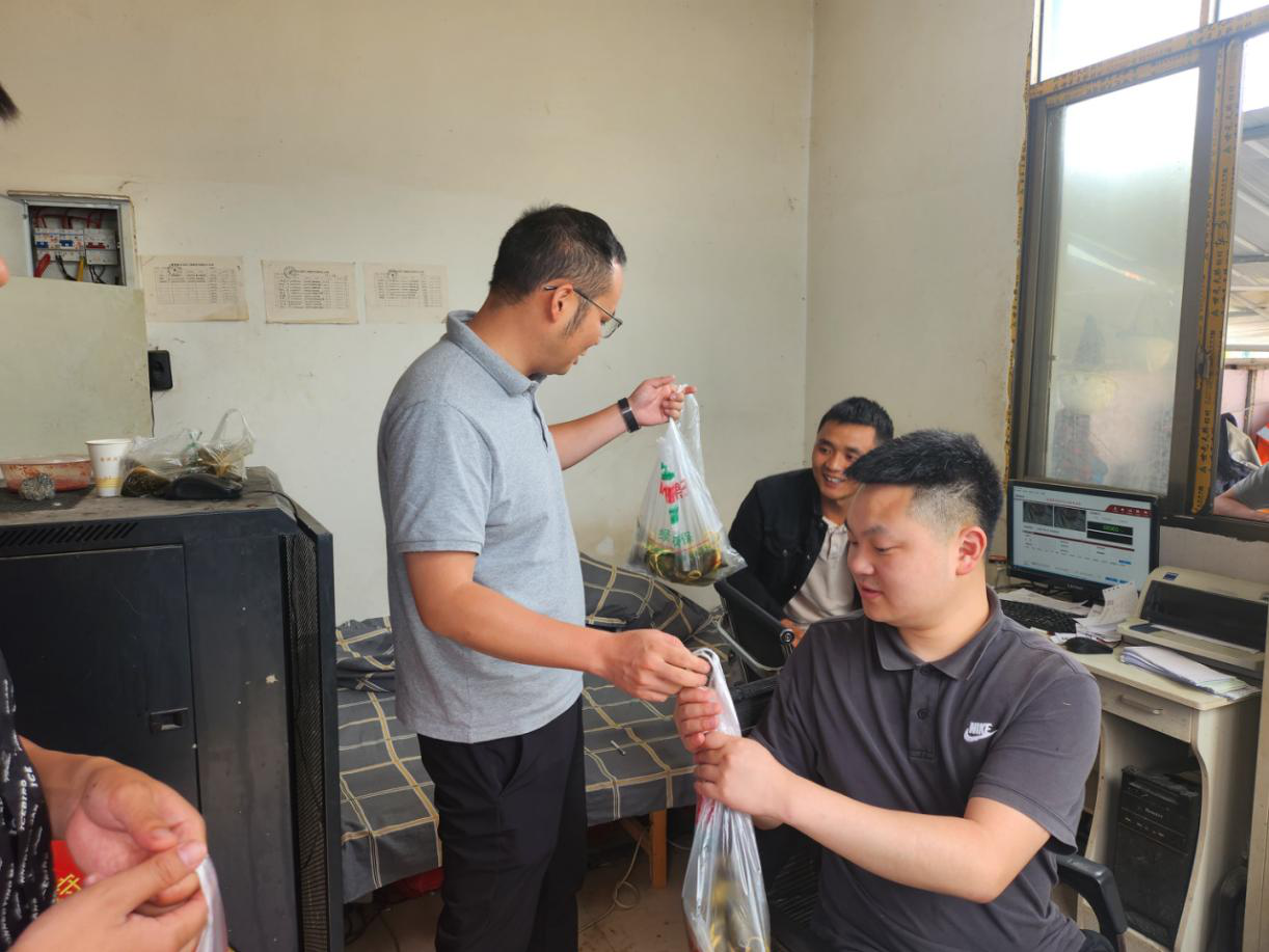 公司食堂內,歡聲笑語一片!大家通力合作,在廚房阿姨的教學下包出一個個清香軟糯的愛心粽子,一起品嘗分享,整個活動過程洋溢著祥和歡快的節(jié)日氛圍。為讓堅守在代碑寺項目一線崗位的員工感受到組織的溫暖,隨后,公司總經(jīng)理張忠強帶隊奔赴代碑寺項目一線崗位,將包好的粽子送到員工手中,并送去節(jié)日的祝福。