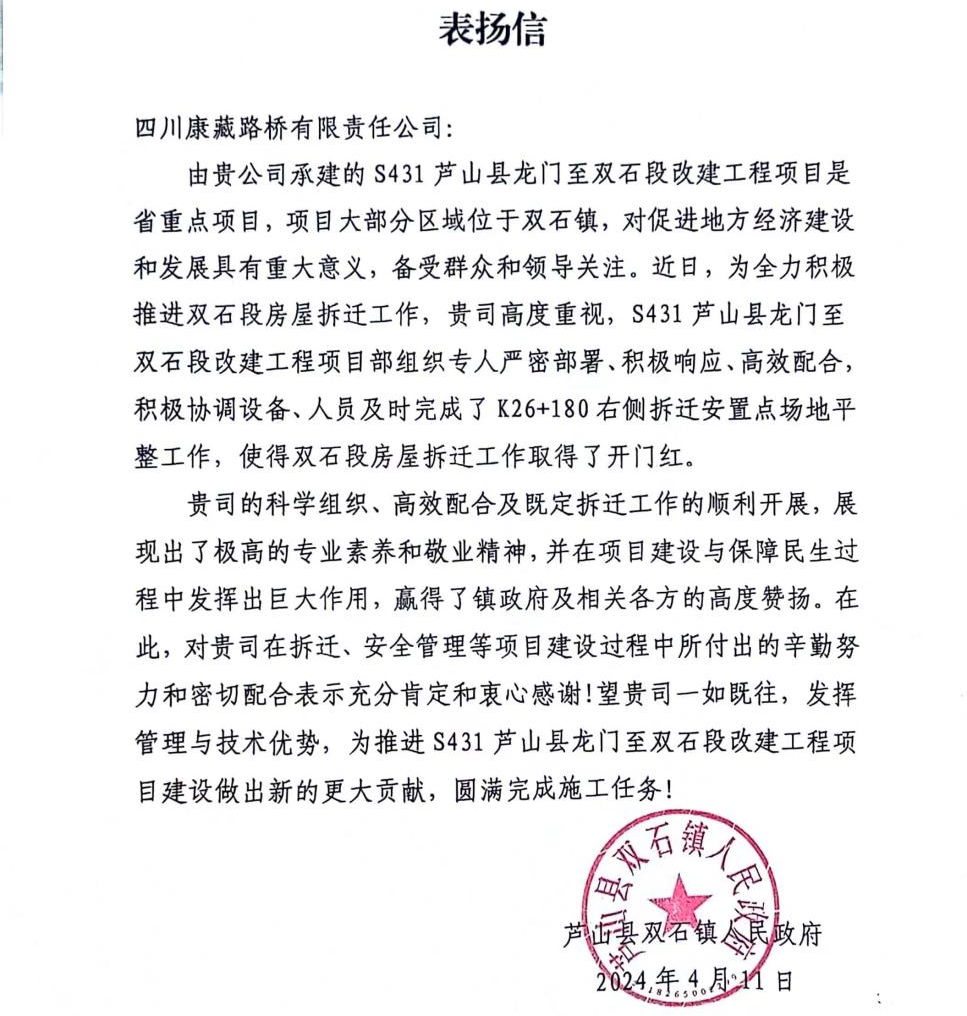 近日,雅安交建集團(tuán)四川康藏路橋有限責(zé)任公司收到來自蘆山縣雙石鎮(zhèn)人民政府的表揚(yáng)信。信中對S431蘆山縣龍門至雙石段改建工程項(xiàng)目部積極協(xié)調(diào)設(shè)備、人員配合當(dāng)?shù)卣瓿蒏26+180右側(cè)拆遷安置點(diǎn)場地平整工作,使得雙石段房屋拆遷工作取得了開門紅給予了高度評價(jià)和贊揚(yáng)。