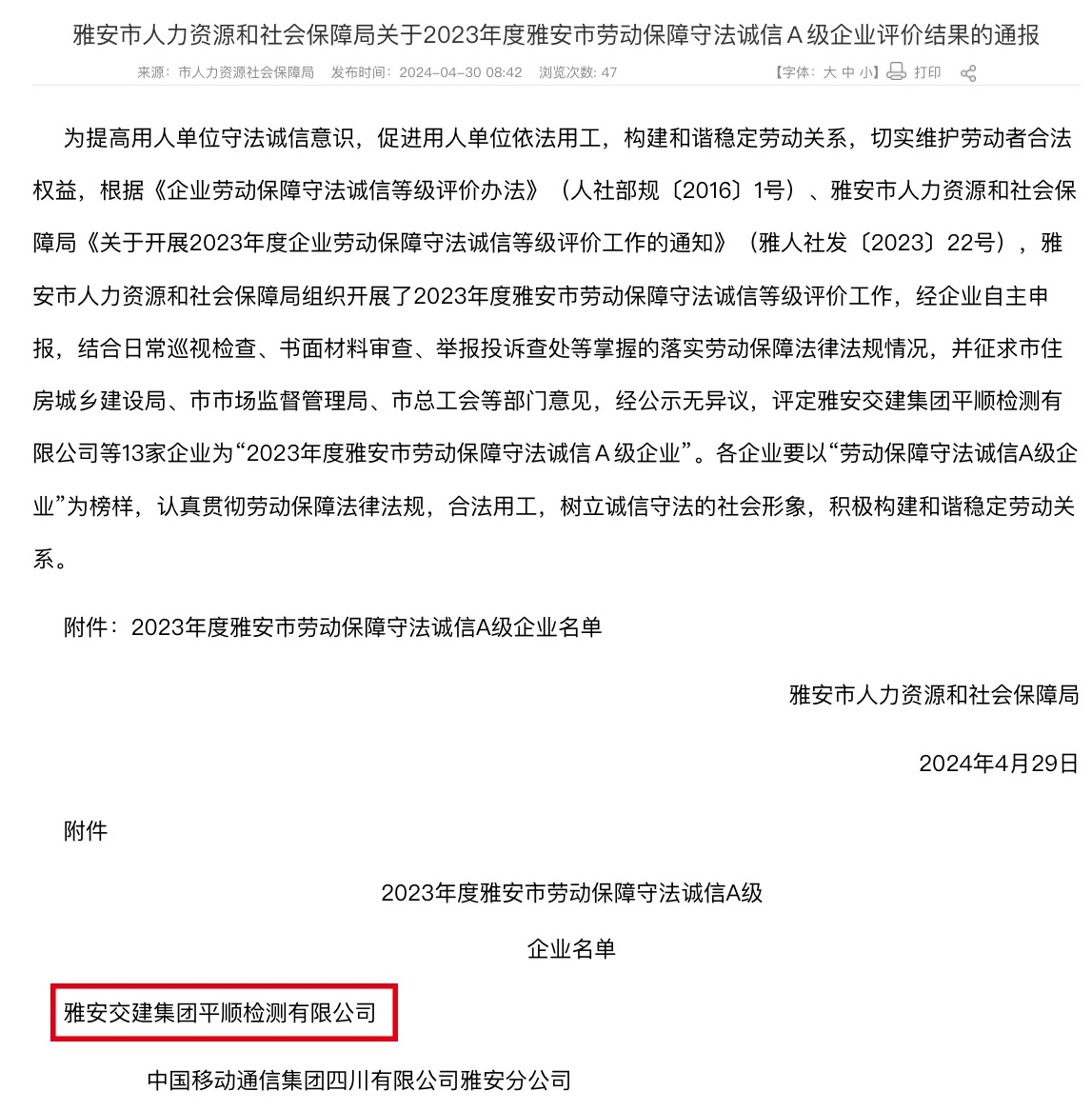 近日,雅安市人社局發(fā)布通報(bào),雅安交建集團(tuán)平順公司被評(píng)定為“2023年度雅安市勞動(dòng)保障守法誠信A級(jí)企業(yè)”。此次評(píng)選由人社局結(jié)合日常巡視檢查、書面材料審查、舉報(bào)投訴查處以及專項(xiàng)檢查等活動(dòng)掌握的落實(shí)勞動(dòng)保障法律法規(guī)情況,并征求市場(chǎng)監(jiān)管局等部門和單位意見后,綜合評(píng)定而出。