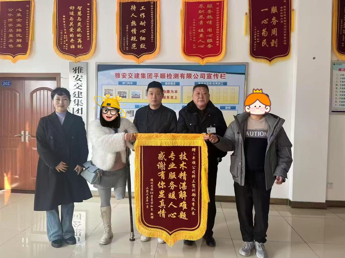 “合格了,感謝你們給予我貼心的照顧和一路陪伴,讓我順利通過考試,幫助我完成了人生中的一件大事!”近日,雅州駕校殘疾考生宋女士將一面印有“技術(shù)精湛解難題 專業(yè)服務(wù)暖人心 感謝有你顯真情”字樣的錦旗送到了平順公司,對(duì)工作人員為他們提供熱情、周到的服務(wù)表示感謝。