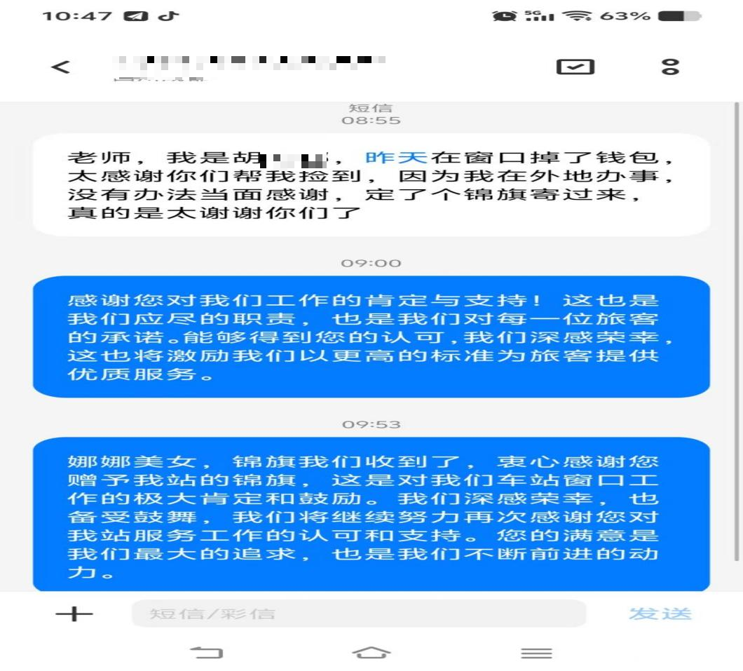 5月14日11時11分,售票員郝凌云發(fā)現(xiàn)柜臺上遺留了一個卡包,內(nèi)有現(xiàn)金 300 元、多張銀行卡、身份證及社?ǖ戎匾锲。郝凌云第一時間上報值班科長,通過站務(wù)系統(tǒng)比對購票信息,僅用5分鐘便鎖定失主為即將前往漢源的旅客胡女士,此時胡女士正在等待檢票,尚未察覺錢包丟失。值班站長通過廣播系統(tǒng)緊急尋人,胡女士聽到廣播后立即前往值班室認(rèn)領(lǐng)物品,經(jīng)值班科長仔細核對身份及物品信息后,將卡包完好歸還。胡女士激動致謝:“太感謝你了!你們汽車站的工作人員素質(zhì)真高,太讓人暖心了!”