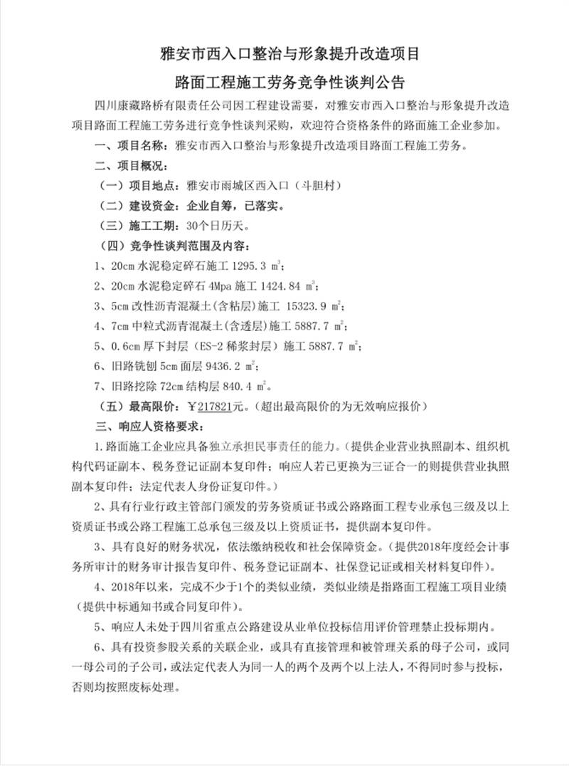 雅安市西入口整治與形象提升改造項目路面工程施工勞務(wù) 競爭性談判公告