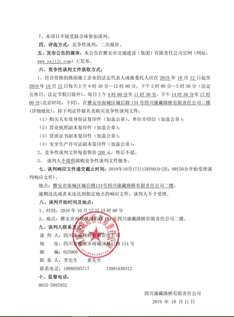 雅安市西入口整治與形象提升改造項目路面材料采購競爭性談判公告