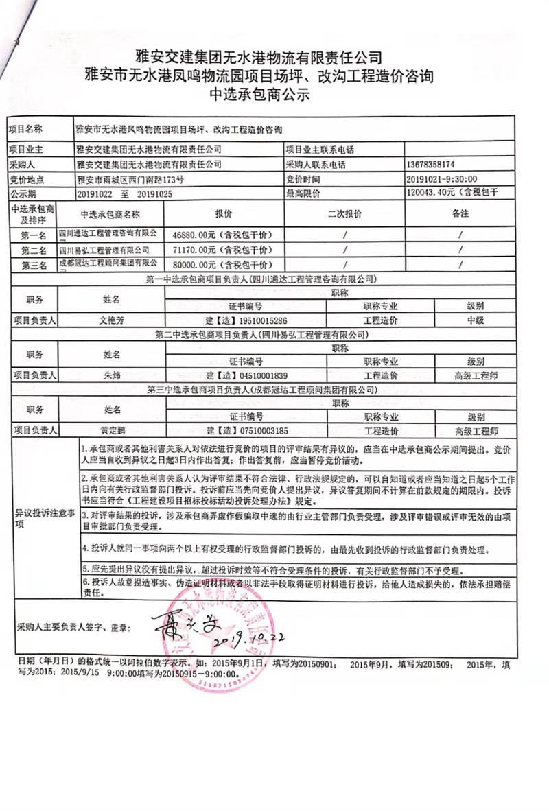 雅安交建集團(tuán)無水港物流有限責(zé)任公司雅安市無水港鳳鳴物流園項(xiàng)目場坪、改溝工程造價(jià)咨詢中選承包商公示