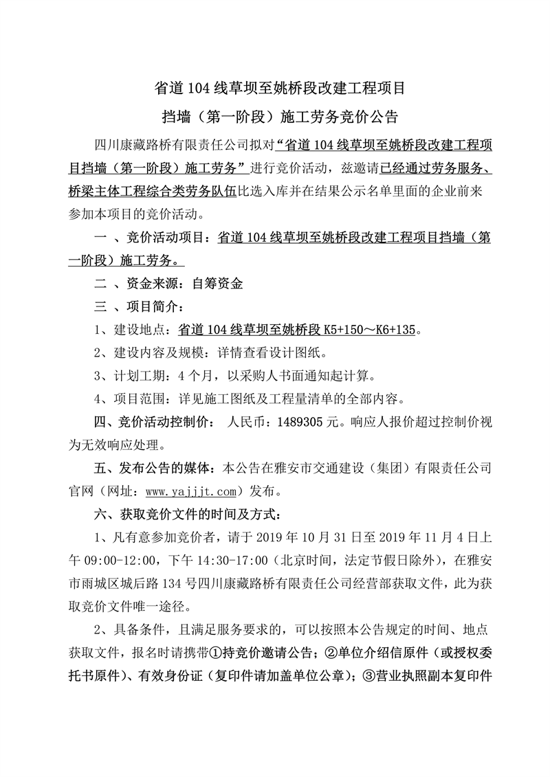 四川康藏路橋有限責(zé)任公司省道104線草壩至姚橋段改建工程項(xiàng)目擋墻(第一階段)施工勞務(wù)競(jìng)價(jià)公告