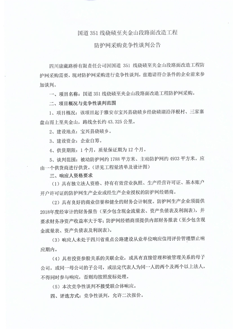 四川康藏路橋有限責(zé)任公司國道351線磽磧至夾金山段路面改造工程防護網(wǎng)采購競爭性談判公告