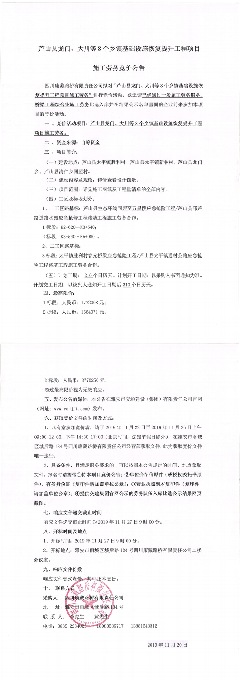 四川康藏路橋有限責(zé)任公司蘆山縣龍門、大川等8個(gè)鄉(xiāng)鎮(zhèn)基礎(chǔ)設(shè)施恢復(fù)提升工程項(xiàng)目施工勞務(wù)競(jìng)價(jià)公告