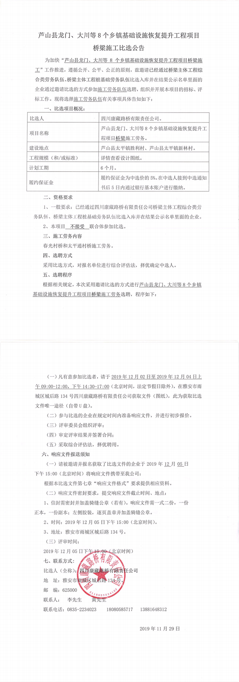 四川康藏路橋有限責(zé)任公司蘆山縣龍門(mén)、大川等8個(gè)鄉(xiāng)鎮(zhèn)基礎(chǔ)設(shè)施恢復(fù)提升工程項(xiàng)目施工勞務(wù)競(jìng)價(jià)結(jié)果公示