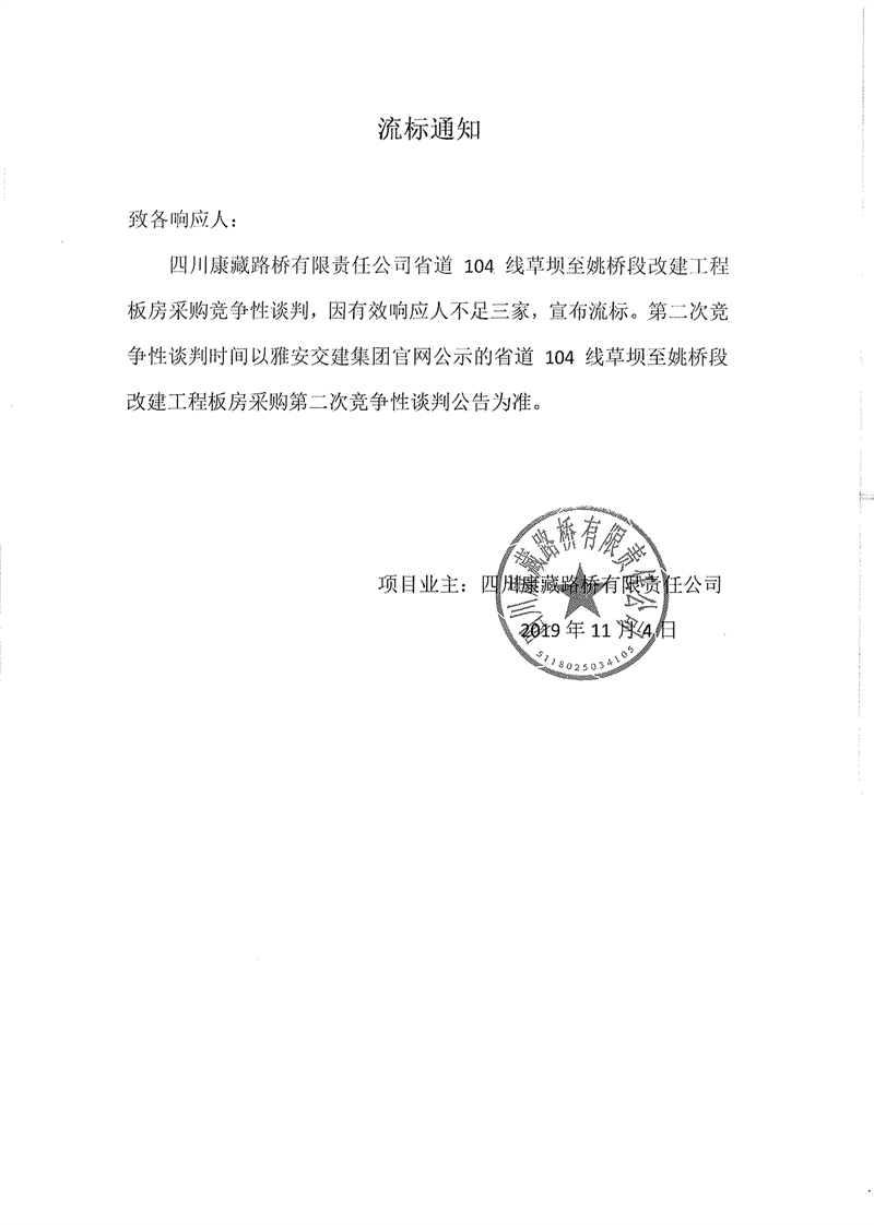 四川康藏路橋有限責(zé)任公司省道104線草壩至姚橋段改建工程板房采購項目流標(biāo)通知