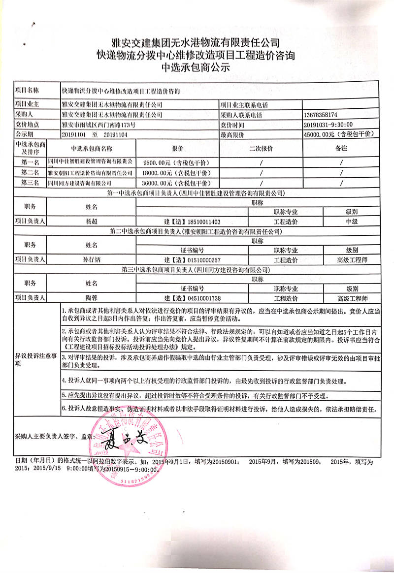 雅安交建集團無水港物流有限責(zé)任公司快遞物流分撥中心維修改造項目工程造價咨詢中選承包商公示