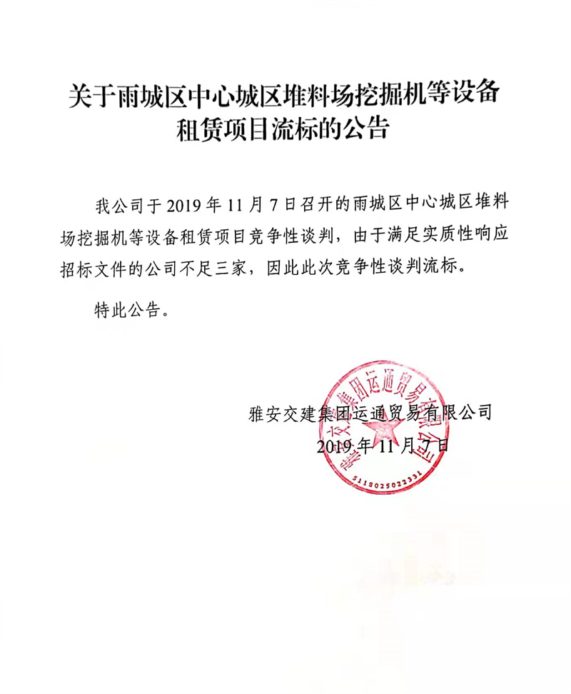 雅安交建集團運通貿(mào)易有限公司關于雨城區(qū)中心城區(qū)堆料場挖掘機等設備租賃項目流標的公告