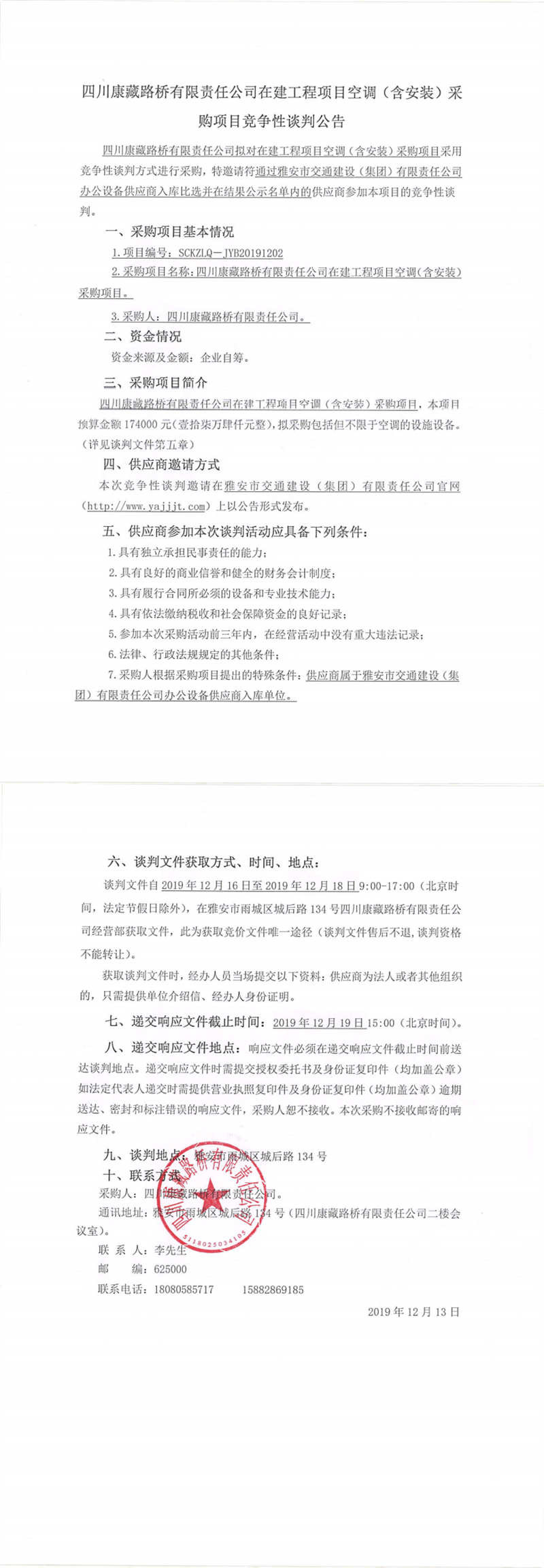 四川康藏路橋有限責(zé)任公司在建工程項目空調(diào)(含安裝)采購項目競爭性談判公告