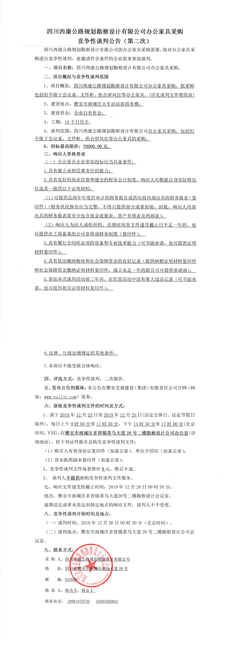 四川西康公路規(guī)劃勘察設(shè)計(jì)有限公司辦公家具采購競爭性談判公告(第二次)
