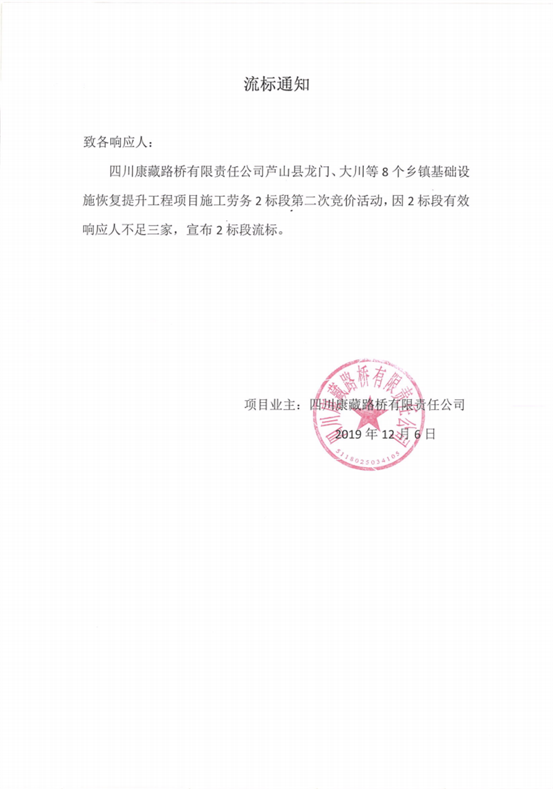 四川康藏路橋有限責(zé)任公司蘆山縣龍門(mén)、大川等8個(gè)鄉(xiāng)鎮(zhèn)基礎(chǔ)設(shè)施恢復(fù)提升工程項(xiàng)目施工勞務(wù)2標(biāo)段第二次競(jìng)價(jià)流標(biāo)通知