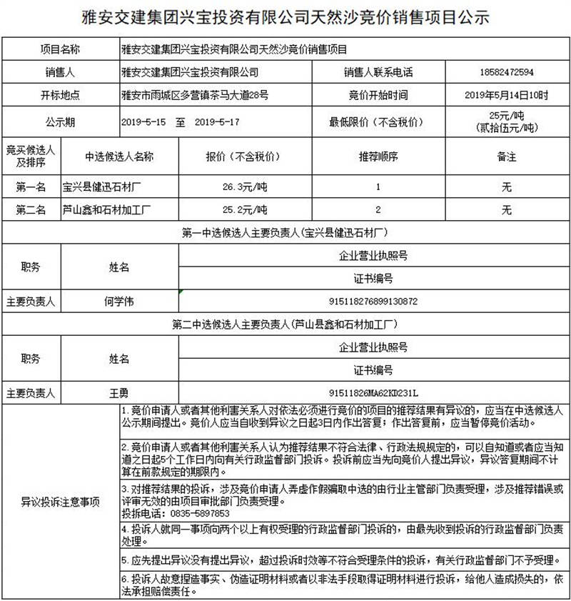 雅安交建集團(tuán)興寶投資有限公司天然沙競價銷售項(xiàng)目公示