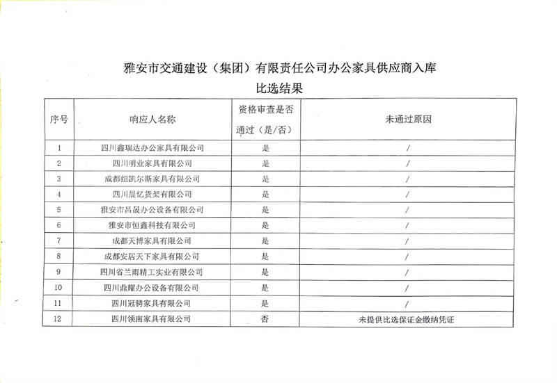 雅安市交通建設(集團)有限責任公司辦公家具供應商入庫比選結果