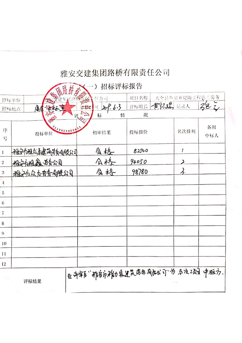 雅安交建集團路橋有限責任公司天全縣魚泉鄉(xiāng)堤防工程施工勞務(wù)項目邀請招標結(jié)果公示