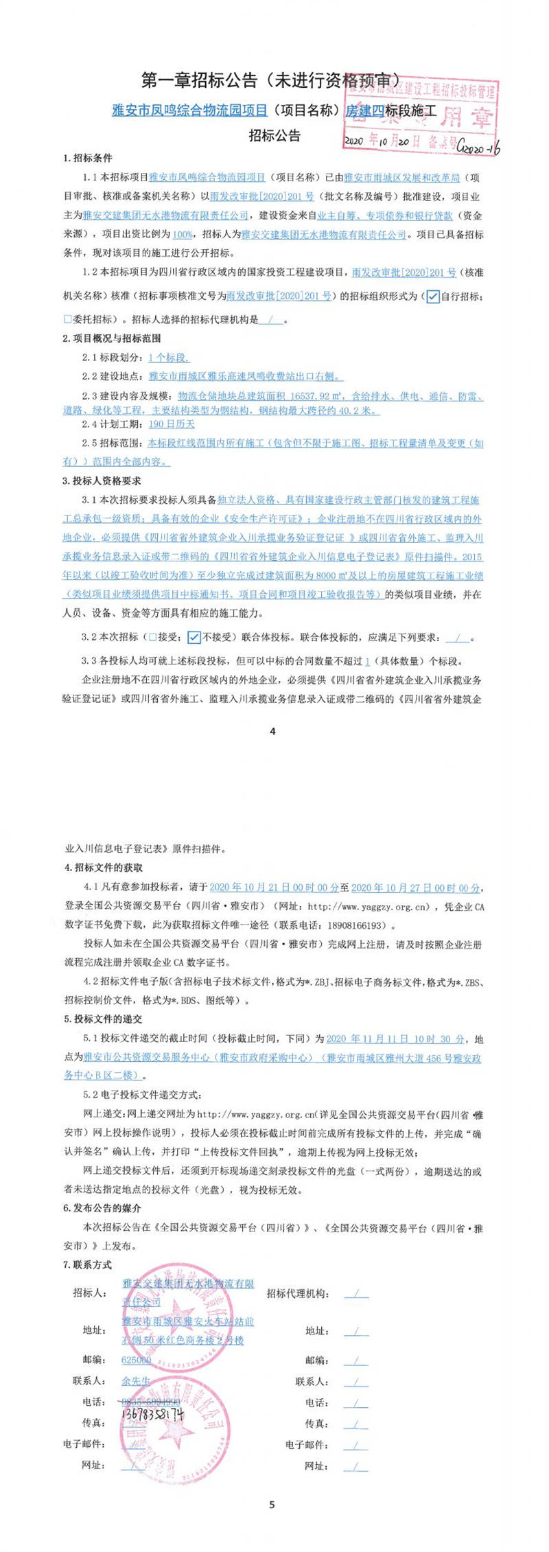 雅安交建集團無水港物流有限責(zé)任公司雅安市鳳鳴綜合物流園項目(項目名稱)房建四標段施工招標公告