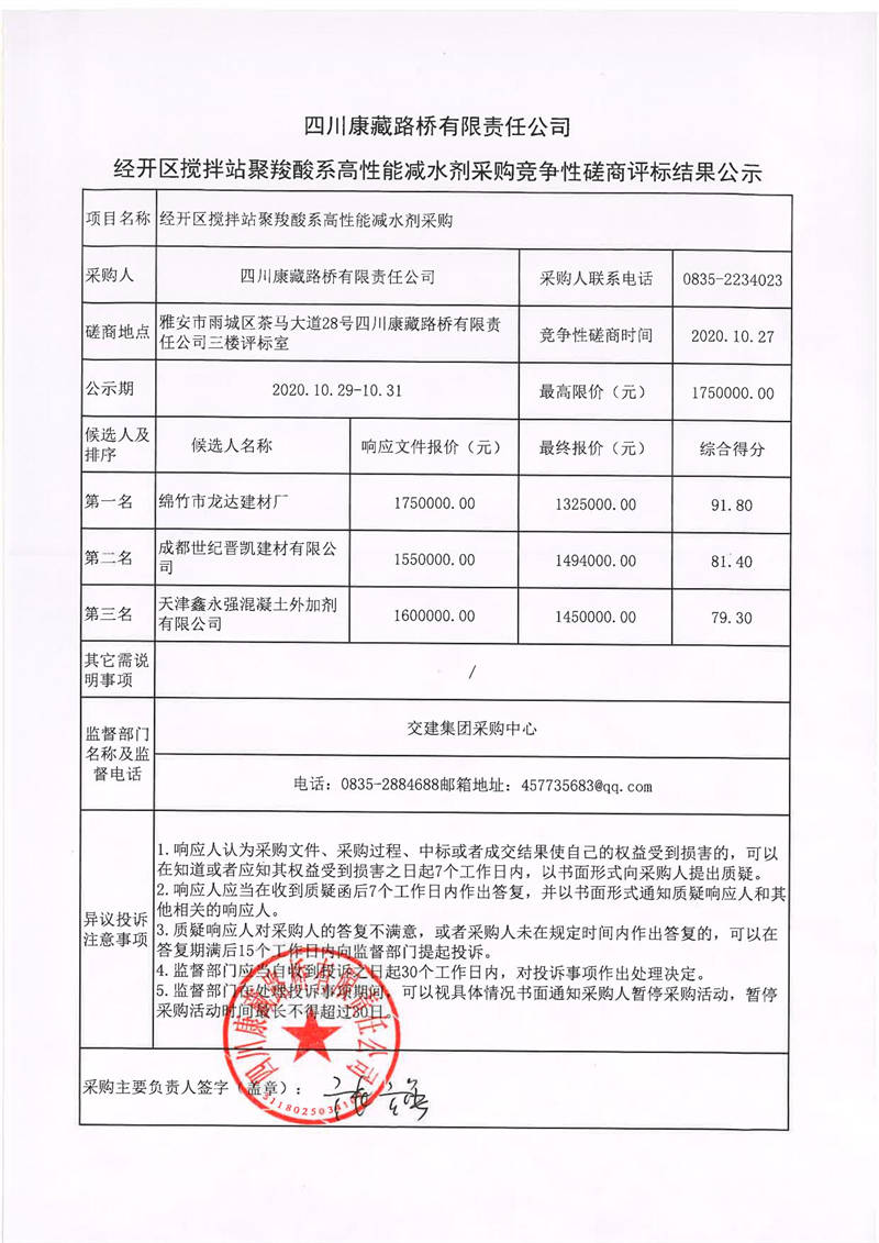 四川康藏路橋有限責(zé)任公司經(jīng)開(kāi)區(qū)攪攔站聚羧酸系高性能減水劑采購(gòu)競(jìng)爭(zhēng)性磋商評(píng)標(biāo)結(jié)果公示