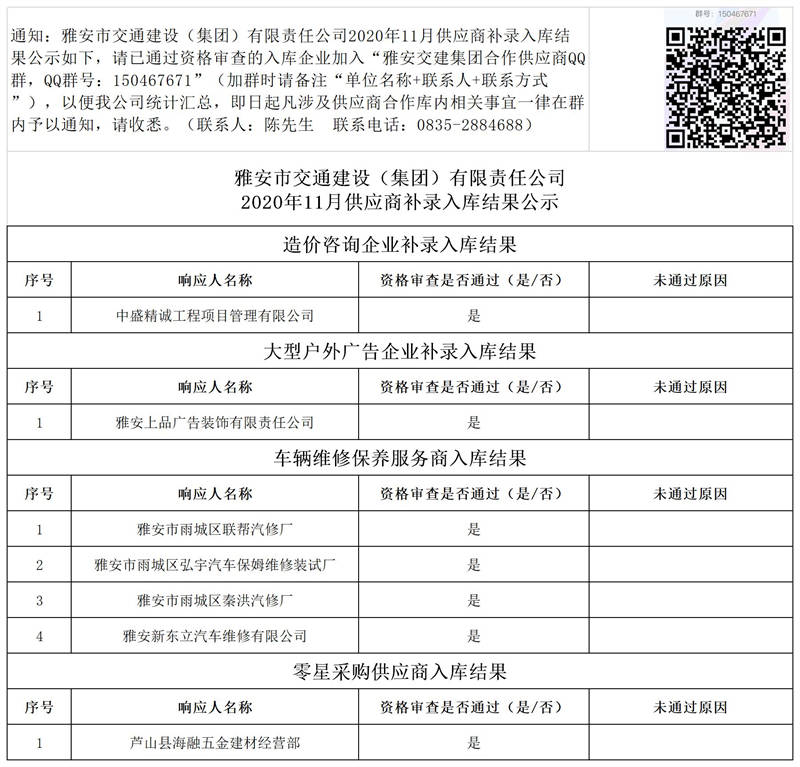 雅安市交通建設(shè)(集團)有限責(zé)任公司2020年11月供應(yīng)商補錄入庫結(jié)果公示