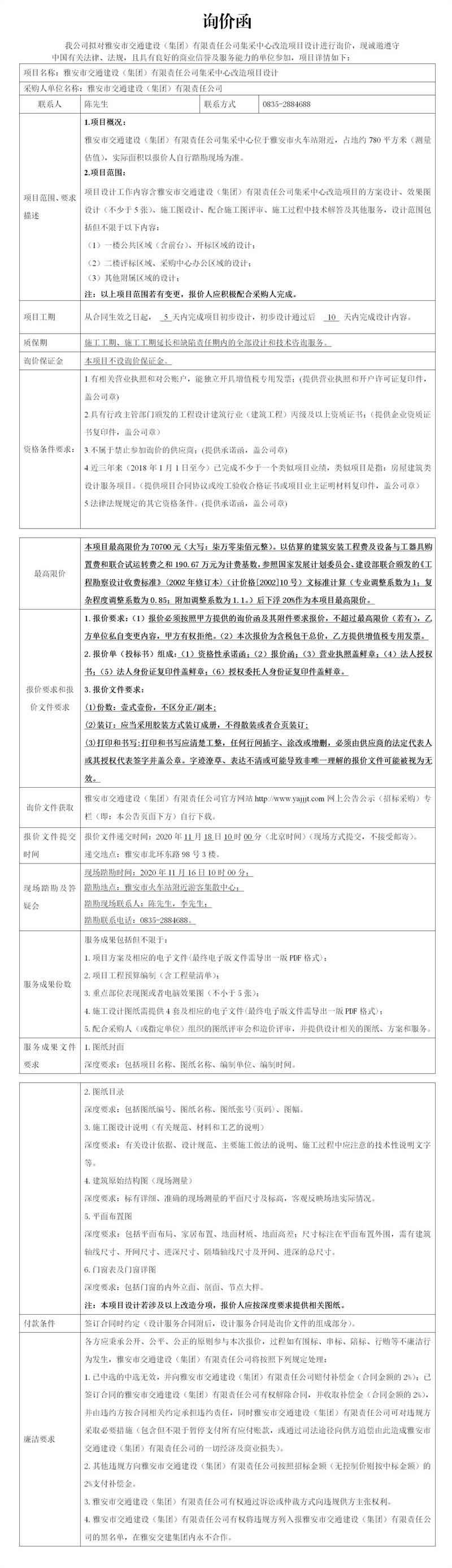 雅安市交通建設(shè)(集團)有限責任公司集采中心改造項目設(shè)計詢價公告