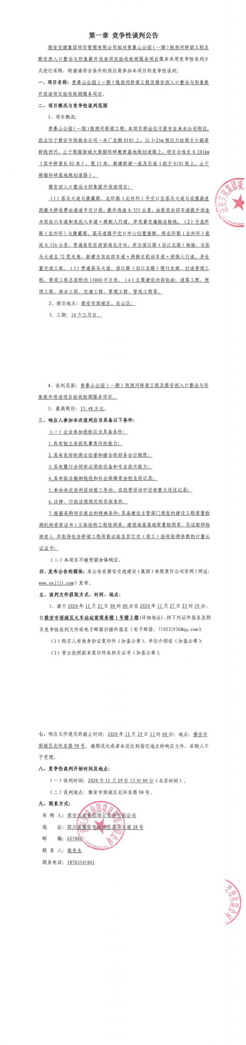 雅安交建集團(tuán)項目管理有限公司青鼻山公園(一期)隴西河橋梁工程及雅安西入口整治與形象提升改造項目驗收檢測服務(wù)項目競爭性談判公告