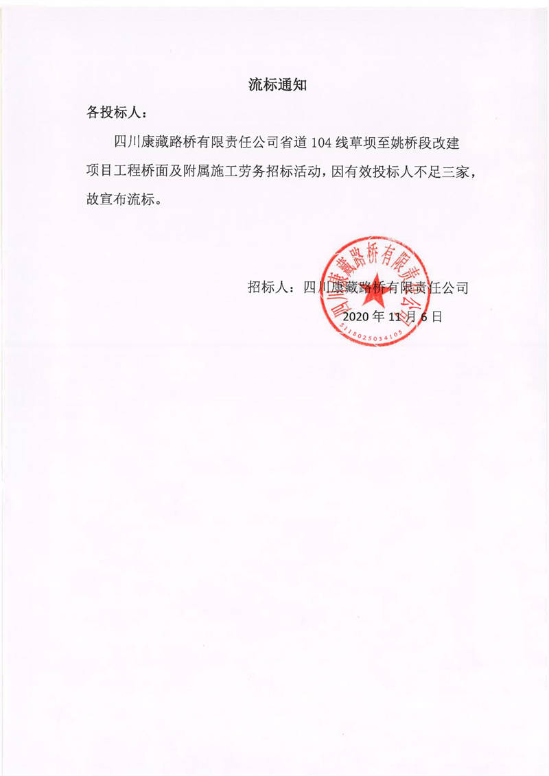 四川康藏路橋有限責(zé)任公司省道104線草壩至姚橋段改建項目工程橋面及附屬施工勞務(wù)流標通知