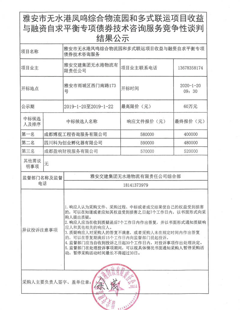 雅安市無(wú)水港鳳鳴綜合物流園和多式聯(lián)運(yùn)項(xiàng)目收益與融資自求平衡專(zhuān)項(xiàng)債券技術(shù)咨詢(xún)服務(wù)競(jìng)爭(zhēng)性談判結(jié)果公示