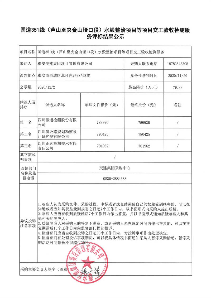 雅安交建集團(tuán)項(xiàng)目管理有限公司國(guó)道351線(蘆山至夾金山埡口段)水毀整治項(xiàng)目等項(xiàng)目交工驗(yàn)收檢測(cè)服務(wù)評(píng)標(biāo)結(jié)果公示