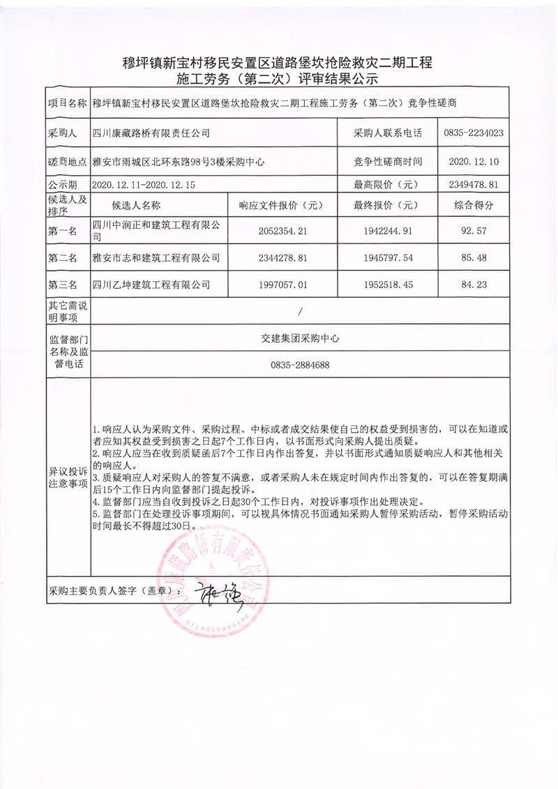四川康藏路橋有限責(zé)任公司穆坪鎮(zhèn)新寶村移民安置區(qū)道路堡坎搶險救災(zāi)二期工程施工勞務(wù)(第二次)評審結(jié)果公示