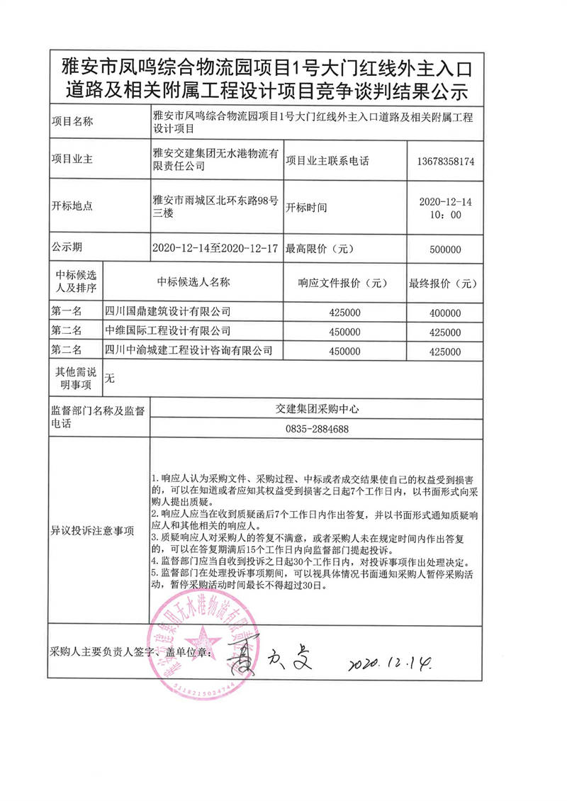 雅安交建集團(tuán)無水港物流有限責(zé)任公司雅安市鳳鳴綜合物流園項(xiàng)目1號大門紅線外主入口道路及相關(guān)附屬工程設(shè)計項(xiàng)目談判結(jié)果公示