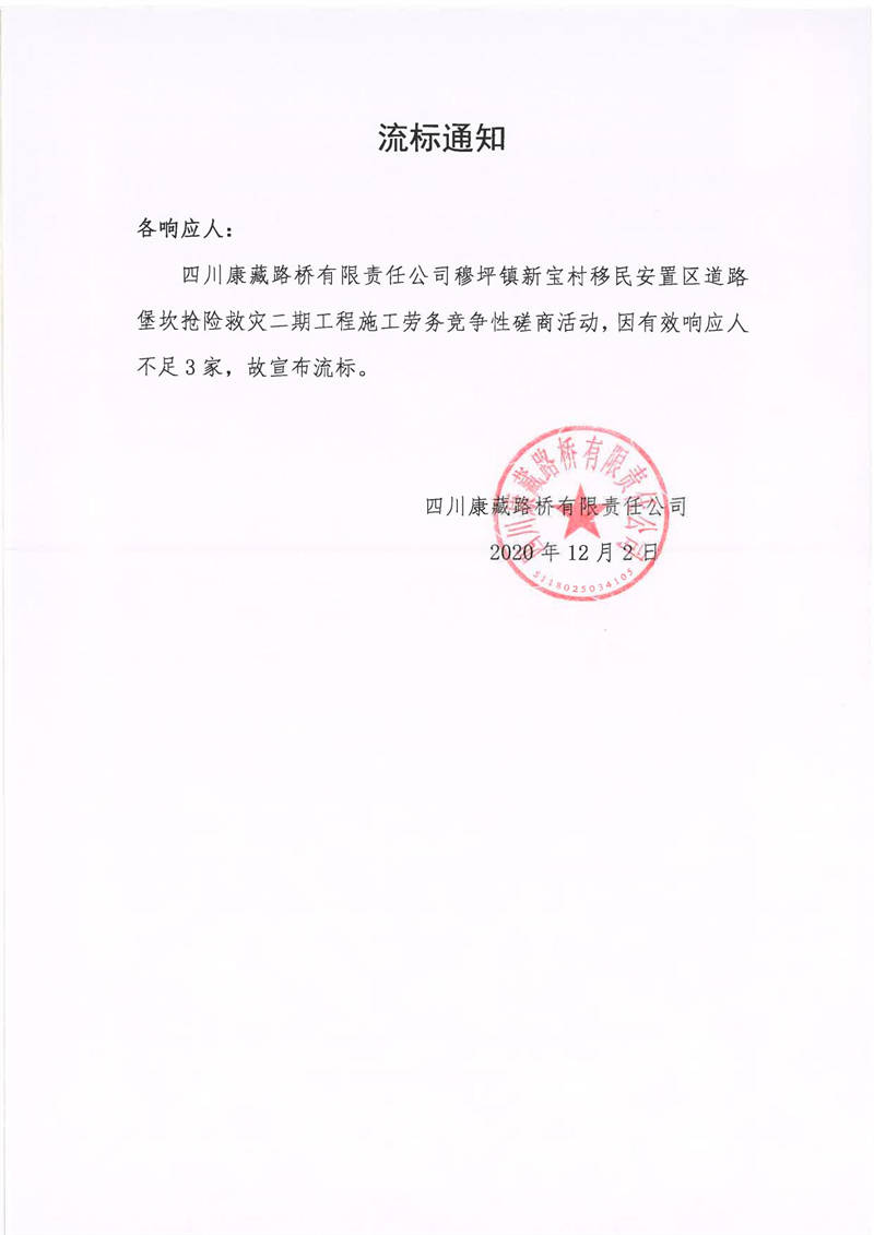 四川康藏路橋有限責(zé)任公司穆坪鎮(zhèn)新寶村移民安置區(qū)道路堡坎搶險救災(zāi)二期工程施工勞務(wù)流標(biāo)通知