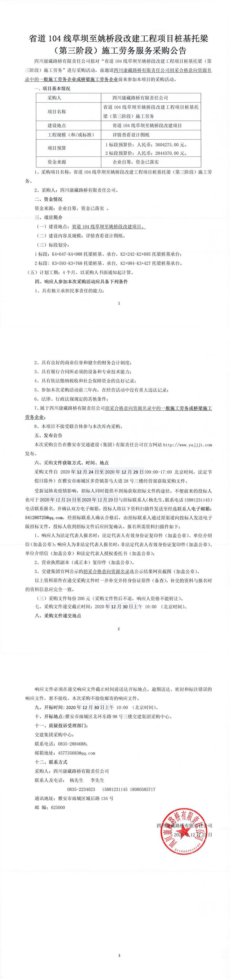 四川康藏路橋有限責(zé)任公司省道104線草壩至姚橋段改建工程項(xiàng)目樁基托梁(第三階段)施工勞務(wù)服務(wù)采購公告