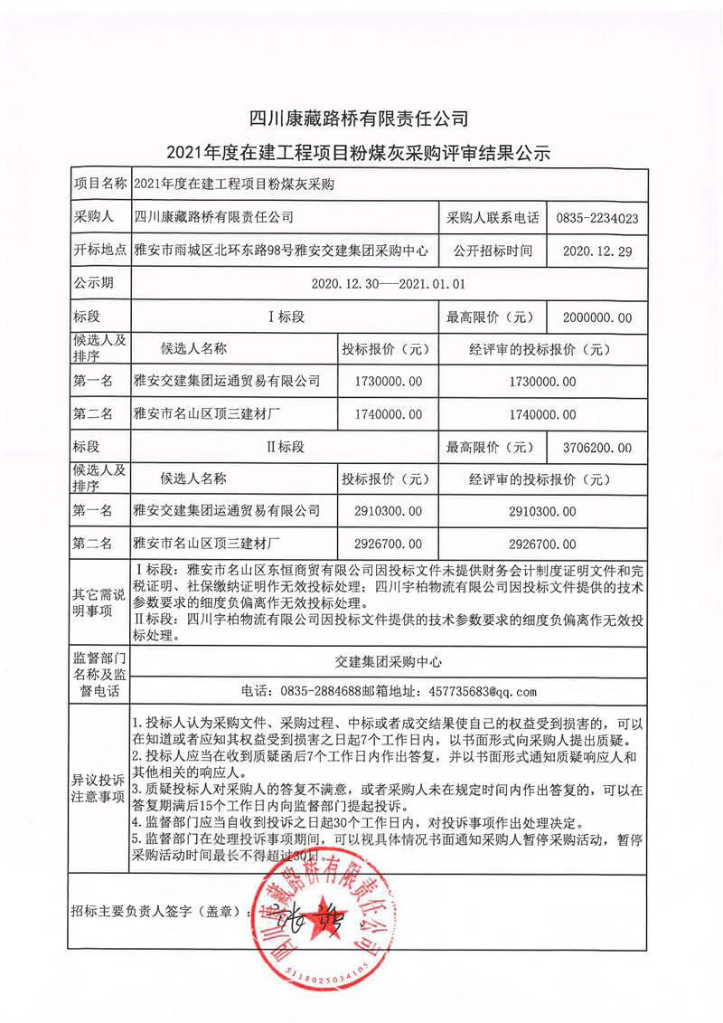 四川康藏路橋有限責(zé)任公司2021年度在建工程項(xiàng)目粉煤灰采購評審結(jié)果公示