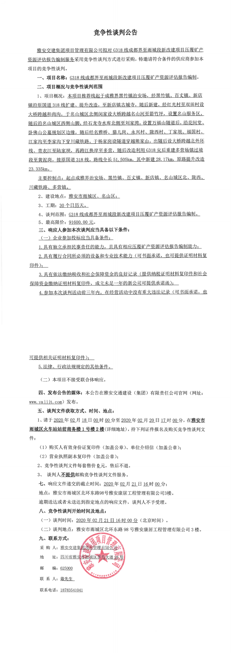 雅安交建集團項目管理有限公司G318線成都界至雨城段新改建項目壓覆礦產(chǎn)資源評估報告編制競爭性談判公告