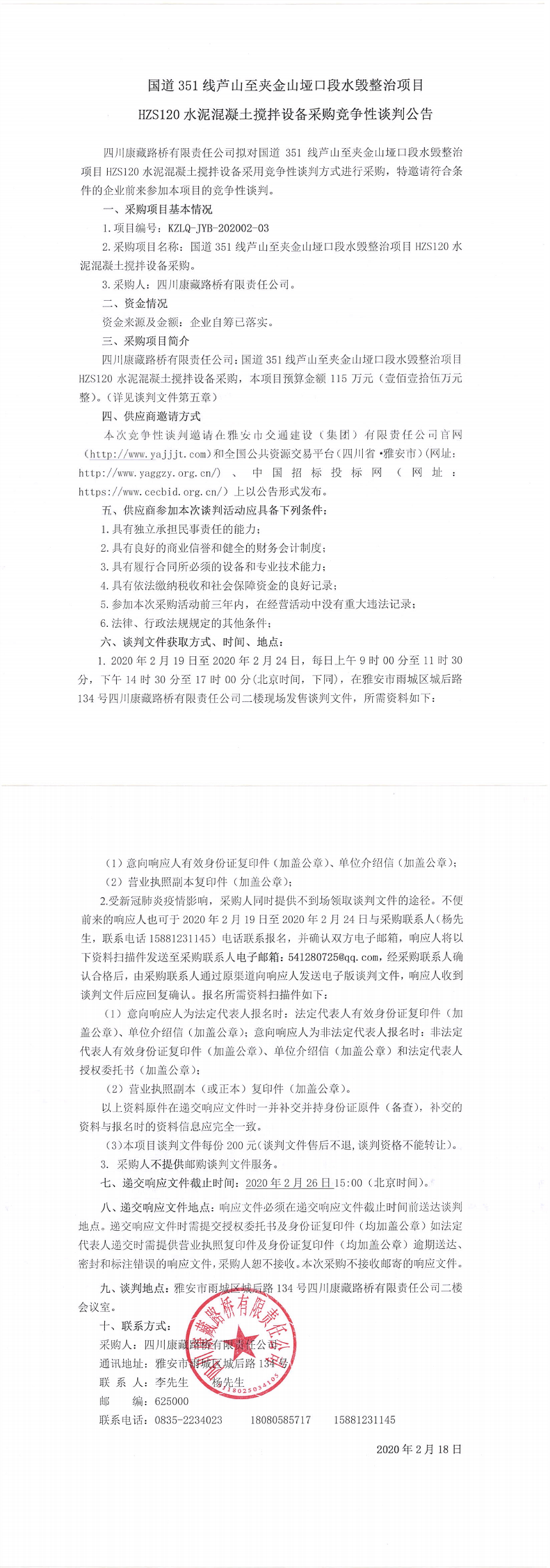 四川康藏路橋有限責(zé)任公司國(guó)道351線蘆山至夾金山埡口段水毀整治項(xiàng)目 HZS120水泥混凝土攪拌設(shè)備采購(gòu)競(jìng)爭(zhēng)性談判公告