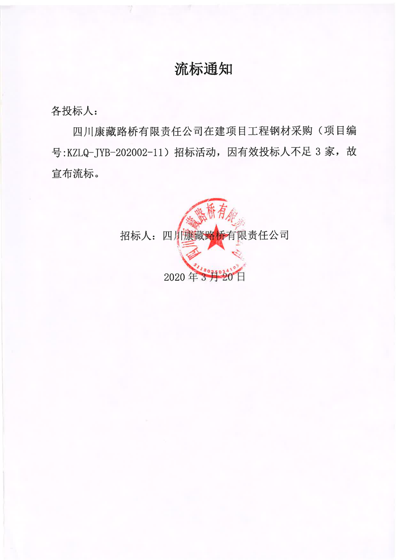 四川康藏路橋有限責(zé)任公司在建項(xiàng)目工程鋼材采購流標(biāo)通知