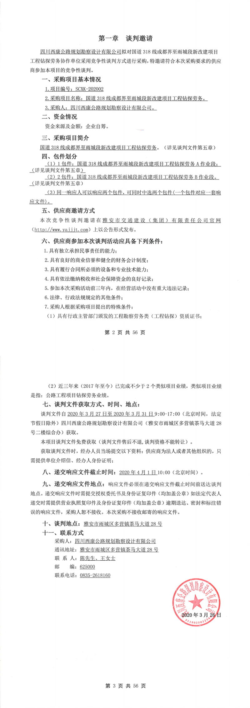 四川西康公路規(guī)劃勘察設(shè)計(jì)有限公司國(guó)道318線(xiàn)成都界至雨城段新改建項(xiàng)目工程鉆探勞務(wù)競(jìng)爭(zhēng)性談判公告