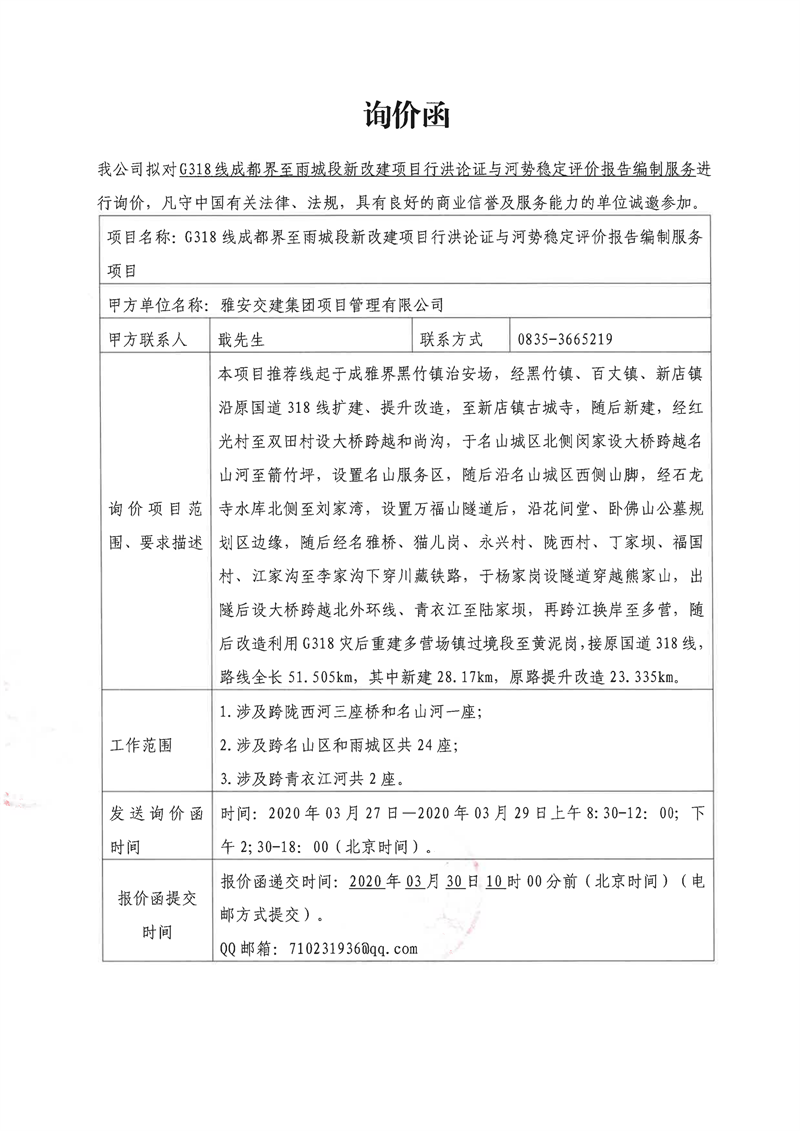 雅安交建集團(tuán)項目管理有限公司G318線成都界至雨城段新改建項目行洪論證與河勢穩(wěn)定評價報告編制服務(wù)項目詢價函