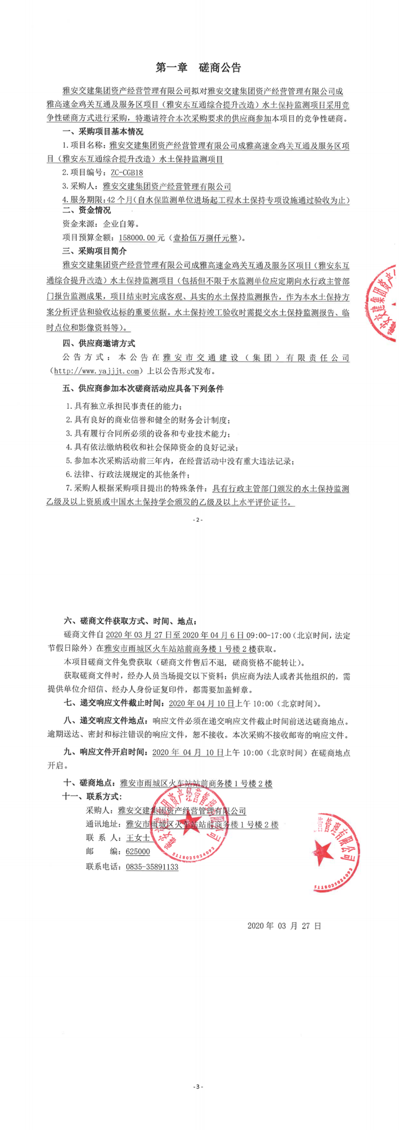 雅安交建集團(tuán)資產(chǎn)經(jīng)營管理有限公司成雅高速金雞關(guān)互通及服務(wù)區(qū)項(xiàng)目(雅安東互通綜合提升改造)水土保持監(jiān)測項(xiàng)目競爭性磋商公告