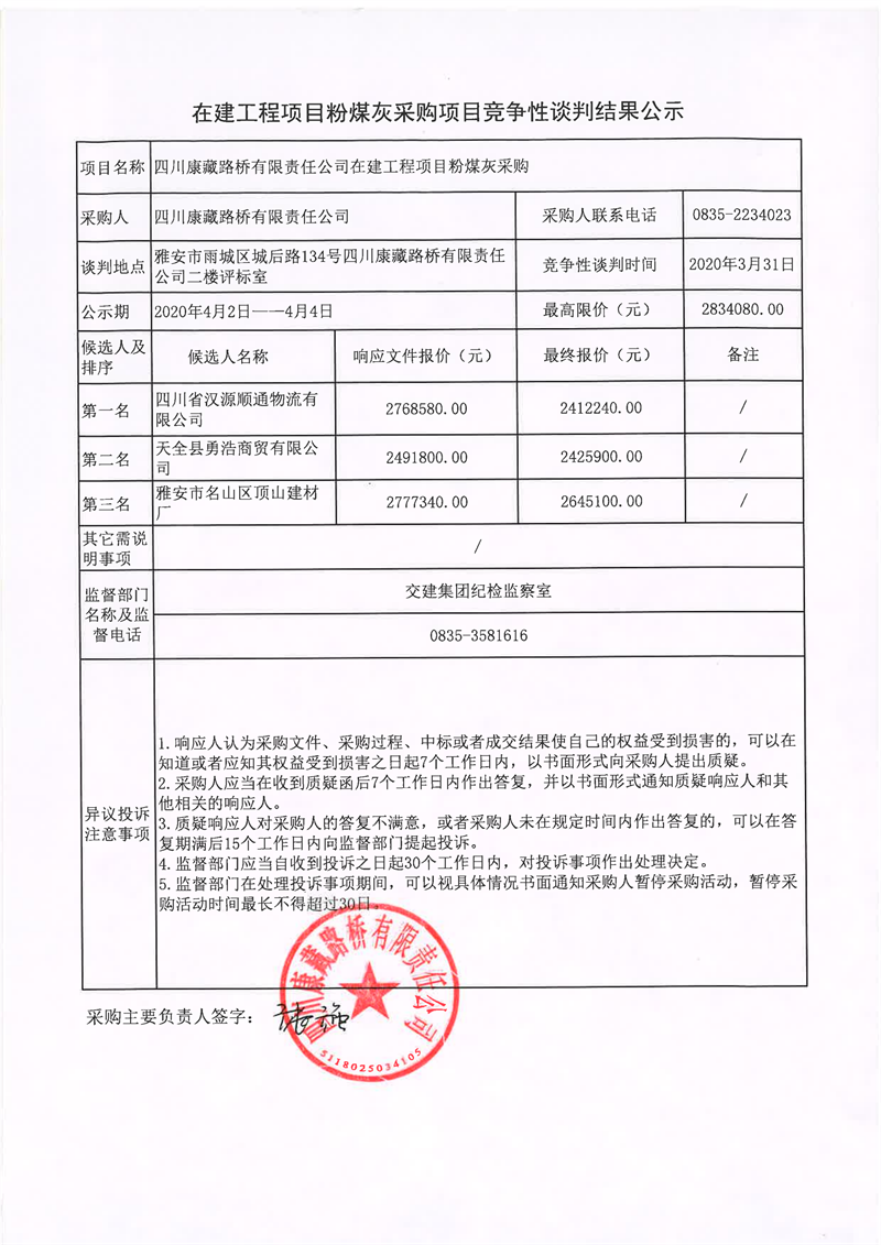 四川康藏路橋有限責(zé)任公司在建工程項(xiàng)目粉煤灰采購項(xiàng)目競爭性談判結(jié)果公示
