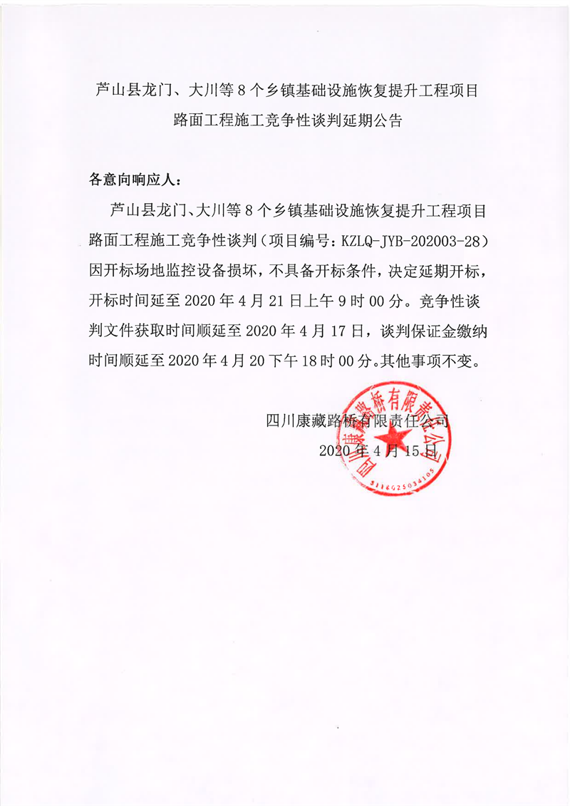 四川康藏路橋有限責任公司蘆山縣龍門、大川等8個鄉(xiāng)鎮(zhèn)基礎(chǔ)設(shè)施恢復(fù)提升工程項目路面工程施工競爭性談判延期公告