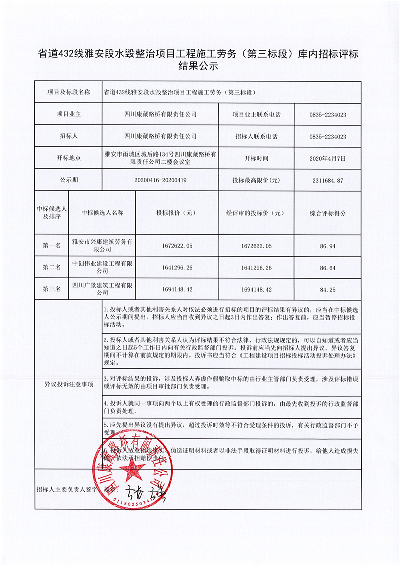 四川康藏路橋有限責(zé)任公司省道432線雅安段水毀整治項目工程施工勞務(wù)(第三標段)庫內(nèi)招標評標結(jié)果公示