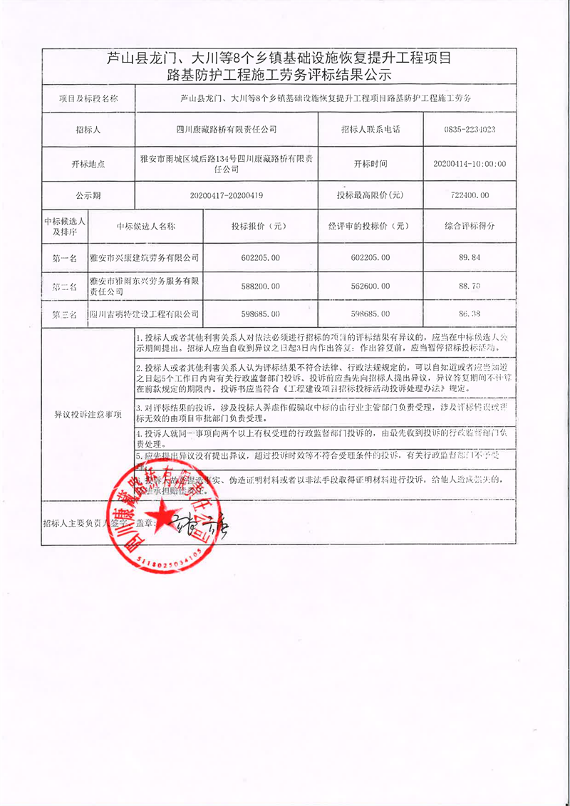 四川康藏路橋有限責(zé)任公司蘆山縣龍門(mén)、大川等8個(gè)鄉(xiāng)鎮(zhèn)基礎(chǔ)設(shè)施恢復(fù)提升工程項(xiàng)目路基防護(hù)工程施工勞務(wù)評(píng)標(biāo)結(jié)果公示