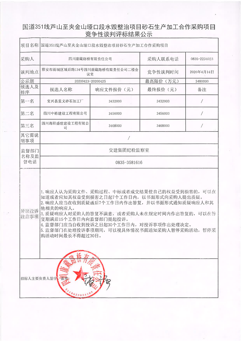 四川康藏路橋有限責(zé)任公司國(guó)道351線(xiàn)蘆山至夾金山埡口段水毀整治項(xiàng)目砂石生產(chǎn)加工合作采購(gòu)項(xiàng)目競(jìng)爭(zhēng)性談判評(píng)標(biāo)結(jié)果公示