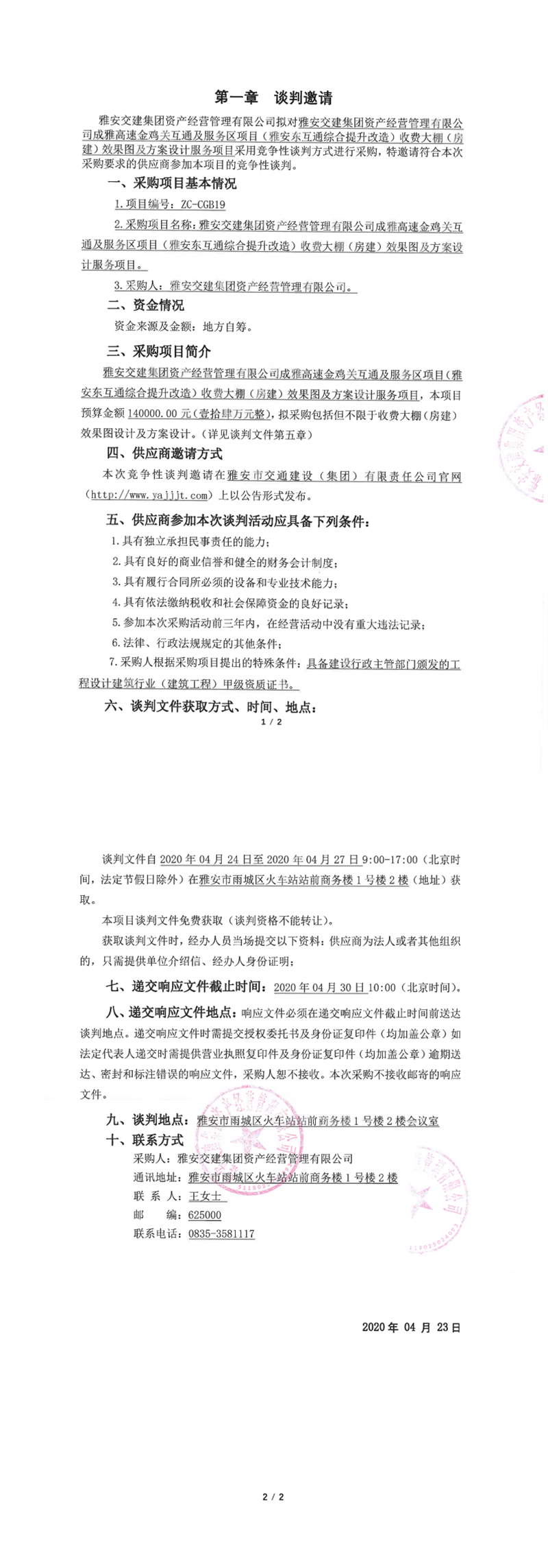 雅安交建集團(tuán)資產(chǎn)經(jīng)營管理有限公司成雅高速金雞關(guān)互通及服務(wù)區(qū)項(xiàng)目(雅安東互通綜合提升改造)收費(fèi)大棚(房建)效果圖及方案設(shè)計(jì)服務(wù)項(xiàng)目競(jìng)爭(zhēng)性談判公告