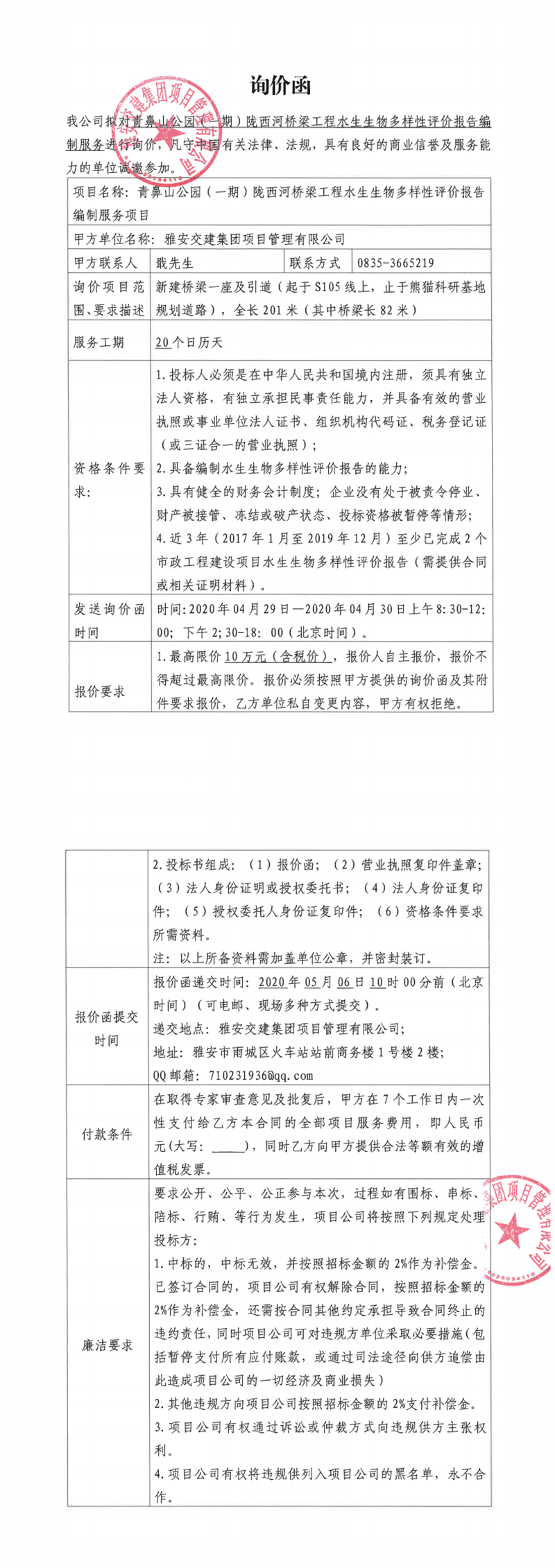 雅安交建集團項目管理有限公司青鼻山公園(一期)隴西河橋梁工程水生生物多樣性評價報告編制服務項目詢價函